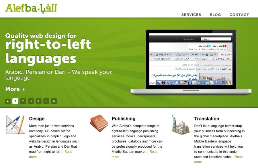 With more than 15 years of experience, US-based Alefba can create professional customized right-to-left websites, social networks, online stores, and multilingual/bilingual sites and blogs, especially those in languages such as Arabic, Persian (Farsi), and Dari.