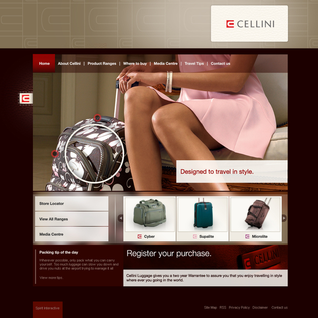 Cellini Luggage is extremely progressive in their approach to the web. One of the challenges we faced was clearly portraying individual brand characteristics of each product range whilst maintaining consistent overall branding for Cellini Luggage. We overcame this challenge with the innovative use of design elements, complementary themes, and creative page layouts.
