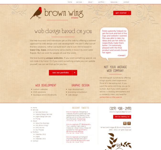 The Brown Wing Studio puts an emphasis on creating custom websites for individuals and small businesses with the need for a carefully crafted web-presence. We treat each site as a unique process and go to great lengths to communicate openly with our clients about cost, timeline, and future goals and expectations. We specialize in website design and logo design. Please see our website for more information.