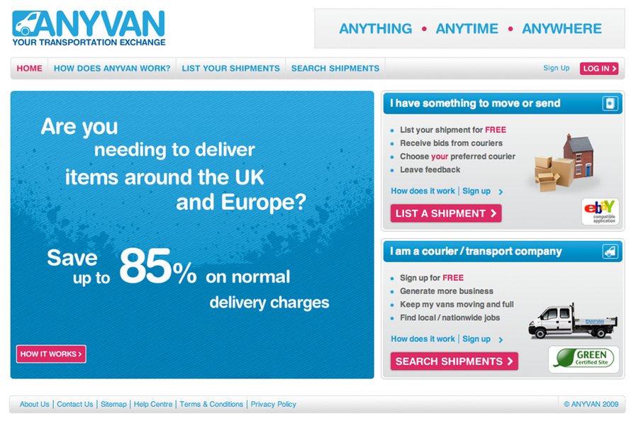 This is a screenshot of the homepage for anyvan.com. Anyvan is a online marketplace for customers looking to move good around the UK.