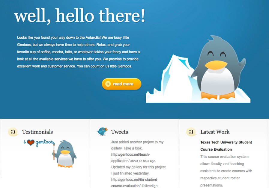 We Gentoos are originally are from Antarctica, but sometimes we like to make our way up to the north. The south can be pretty cold you know. We are not only cute, but we are very smart little Gentoos. When it comes to web design and developing we know what we are doing. Since little hatchlings, we train every Gentoo in the art of web design and developing, specializing in Microsoft technologies. You can trust that we are Masters in our Kung Fu. Take a look at our elite skills.