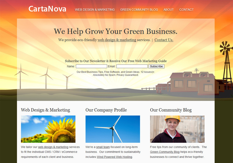 CartaNova provides Ethical, Eco-Friendly Web Design & Marketing. Check out our 'Green Community Blog' for free marketing Tips and our own Wind-Power Web Hosting!