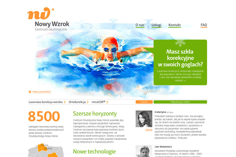 Screenshot from vision clinic corporate web site. Watercolor illustrations unlike commonly used digital images is a truly vivid instrument. As a result - a very picturesque and a very user-friendly site: nowywzrok.pl