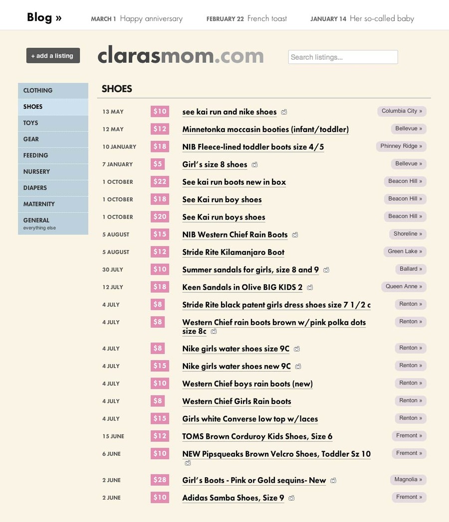 Clarasmom is a classified site for moms & dads in Seattle. The proprietor is a tech savvy new mom adrift in a sea of new & slightly used baby stuff. The options for unloading it were underwhelming, from sketchy Craigslist, to neighborhood news groups and a smattering of mail oriented websites. This site strives to make it as easy as possible to buy and sell extra baby crap.