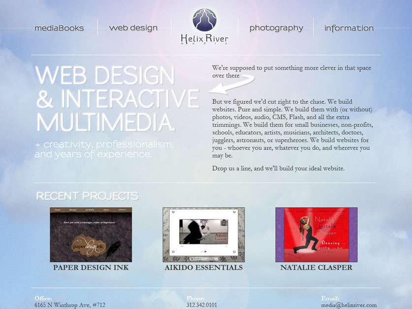 Home page of Helix River Media. Professional web design for small businesses, non-profits, education, and the arts.