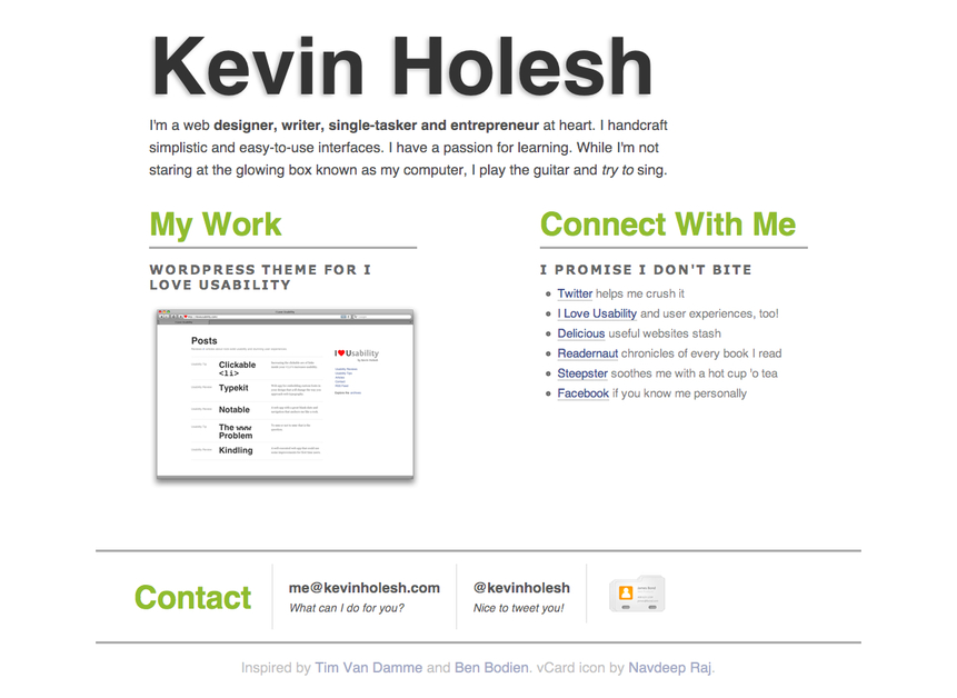 I'm Kevin Holesh, a freelance web producer. I design easy-to-use minimalist interfaces for web applications and also do some back end work.