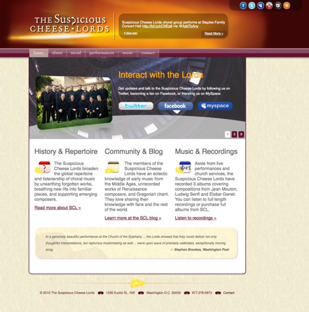 This is an example of an acapella ensemble's website we created. They wanted a heavy focus on contemporary web conventions and interactivity.