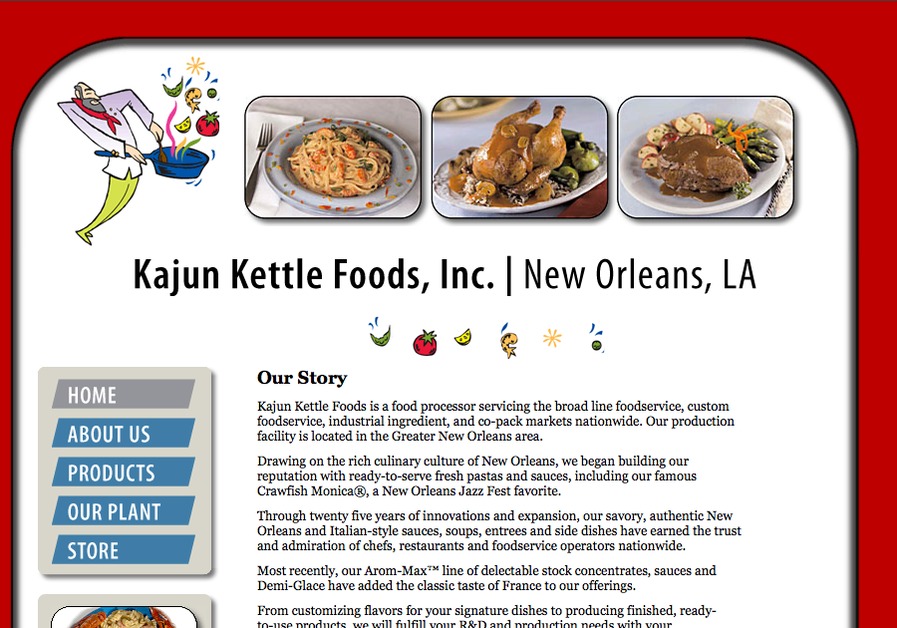 Screenshot of blog-powered site for Kajun Kettle Foods, a prominent food producer in the New Orleans metro area.